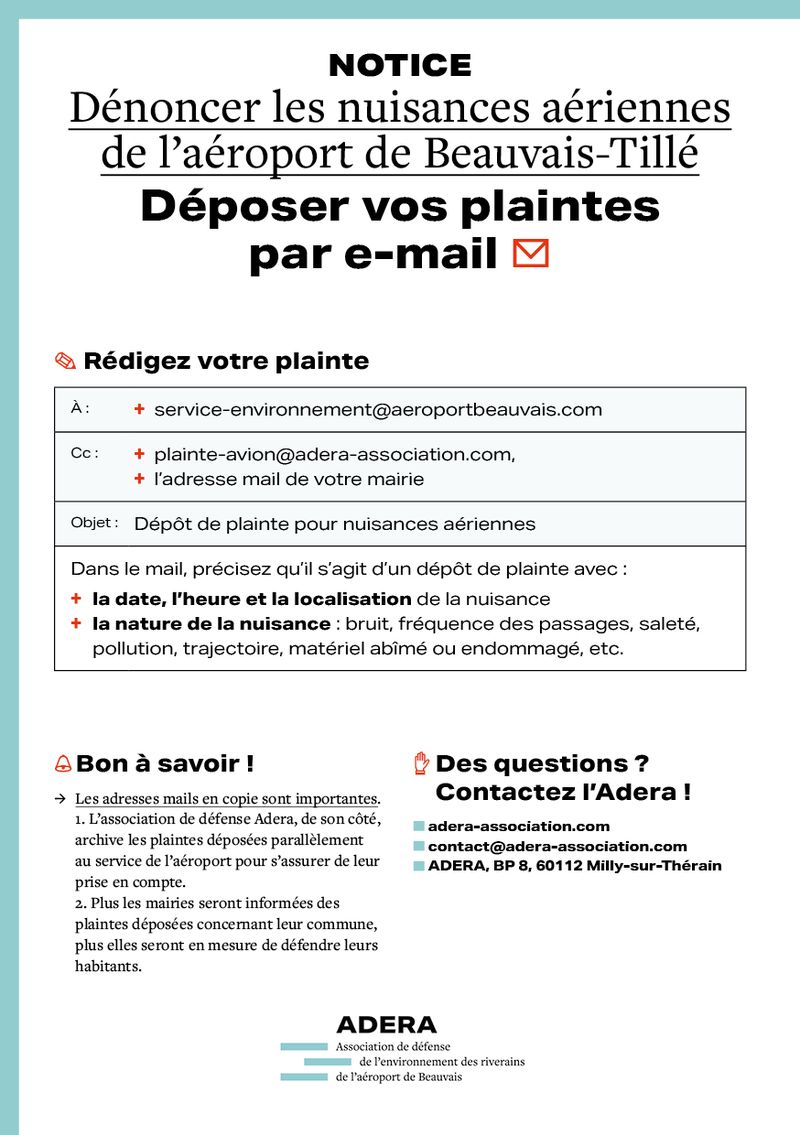 L’ADERA est une association représentant les riverains de l’aéroport de Beauvais-Tillé qui défend l’environnement sur le territoire affecté par les pollutions générées par l’exploitation de l’aérodrome de Beauvais-Tillé.